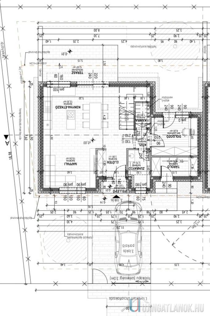 ingatlanonként két gépkocsi számára biztosított, ebből egy parkolóhely a ház előtti területen kialakítható.