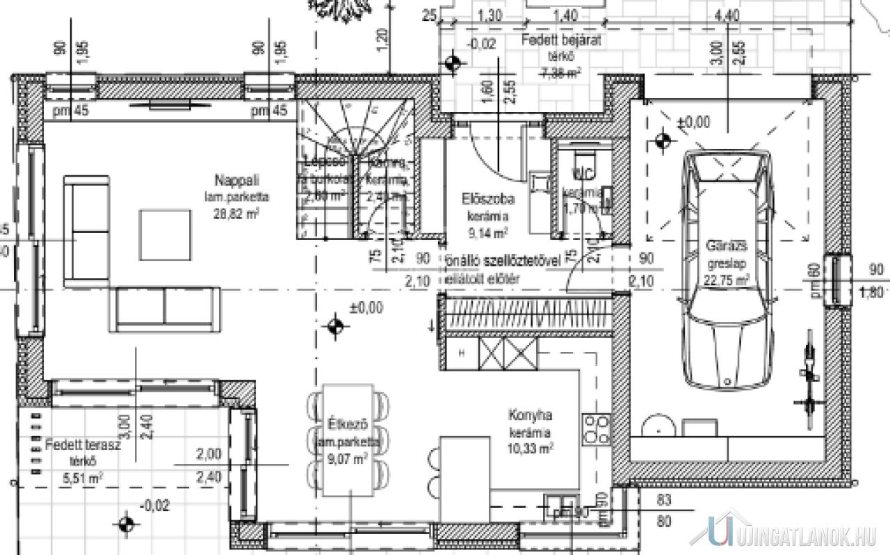 A nettó 145 m2 alapterületű otthonhoz 22,75 m2 garázs tartozik.