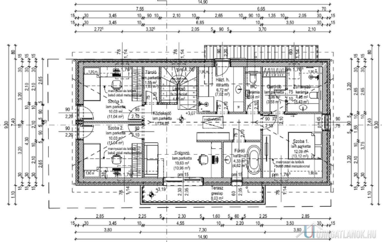 A nettó 145 m2 alapterületű otthonhoz 22,75 m2 garázs tartozik.