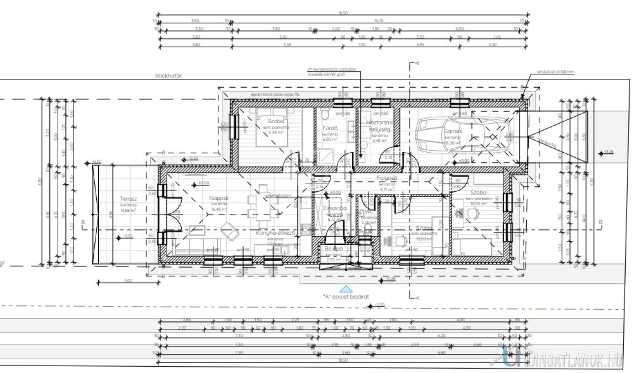 Helyiségei:nappali 18,48 m2 teraszkapcsolattal,előszoba 6,72 m2, folyosó 5,17 m2, háztartási helyiség 5,40 m2, szoba 10,50 m2, szoba 10,92 m2, wc 2,0 m2, fürdő 6,0 m2, szoba 11,40 m2, konyha-étkező 12,18 m2, garázs 18 m2, belépő 2,55 m2, terasz 14,88 m2.