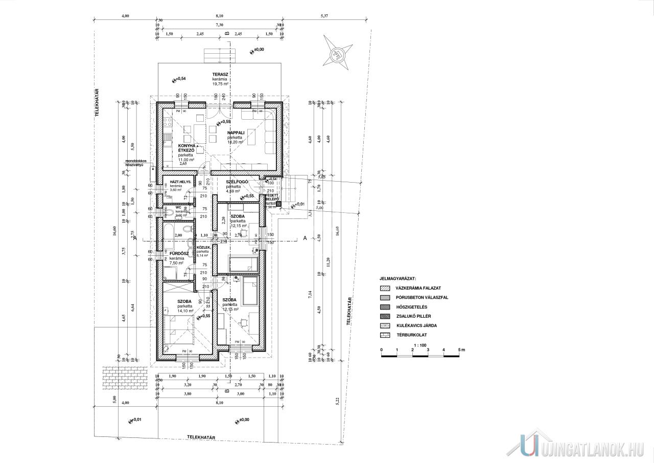 A tartószerkezeti falak Porotherm P30N+F téglából, betonkoszorúval, fa födémes tetőszerkezettel készülnek. A lábazat 10 cm polisztirol lépésálló, a homlokzatok 10cm-es Austrotherm Grafitos, a vízszintes födém 25 cm ásványgyapot szigeteléssel lesz ellátva.