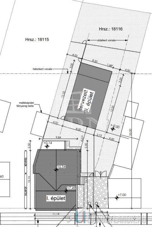 Az ingatlan egy összesen 1014 m²-es telken helyezkedik el, amely két különálló lakóegységre lett megosztva. A hirdetett ház az utcafronti épület, önálló, jól elszeparált, 504 m²-es telekrésszel.