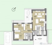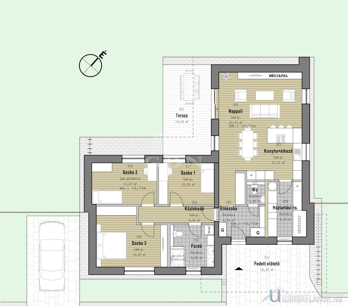 A ház központi életterét egy világos, egybefüggő nappali–étkező–konyha alkotja, amely közvetlen kapcsolatban áll a nagyméretű terasszal, így a belső és külső terek harmonikusan összekapcsolódnak. A bejárat az előszobába vezet, ahonnan külön vendég WC, valamint gardróbbal ellátott közlekedő nyílik. A konyhához közvetlenül kapcsolódik egy külön háztartási és gépészeti helyiség, amely a mindennapi életet kényelmesebbé és rendezettebbé teszi. Az előszobából induló közlekedő egy elkülönített privát zónába vezet, ahol 3 hálószoba, valamint egy zuhanyzós fürdőszoba található, amely igény szerint káddal is bővíthető.