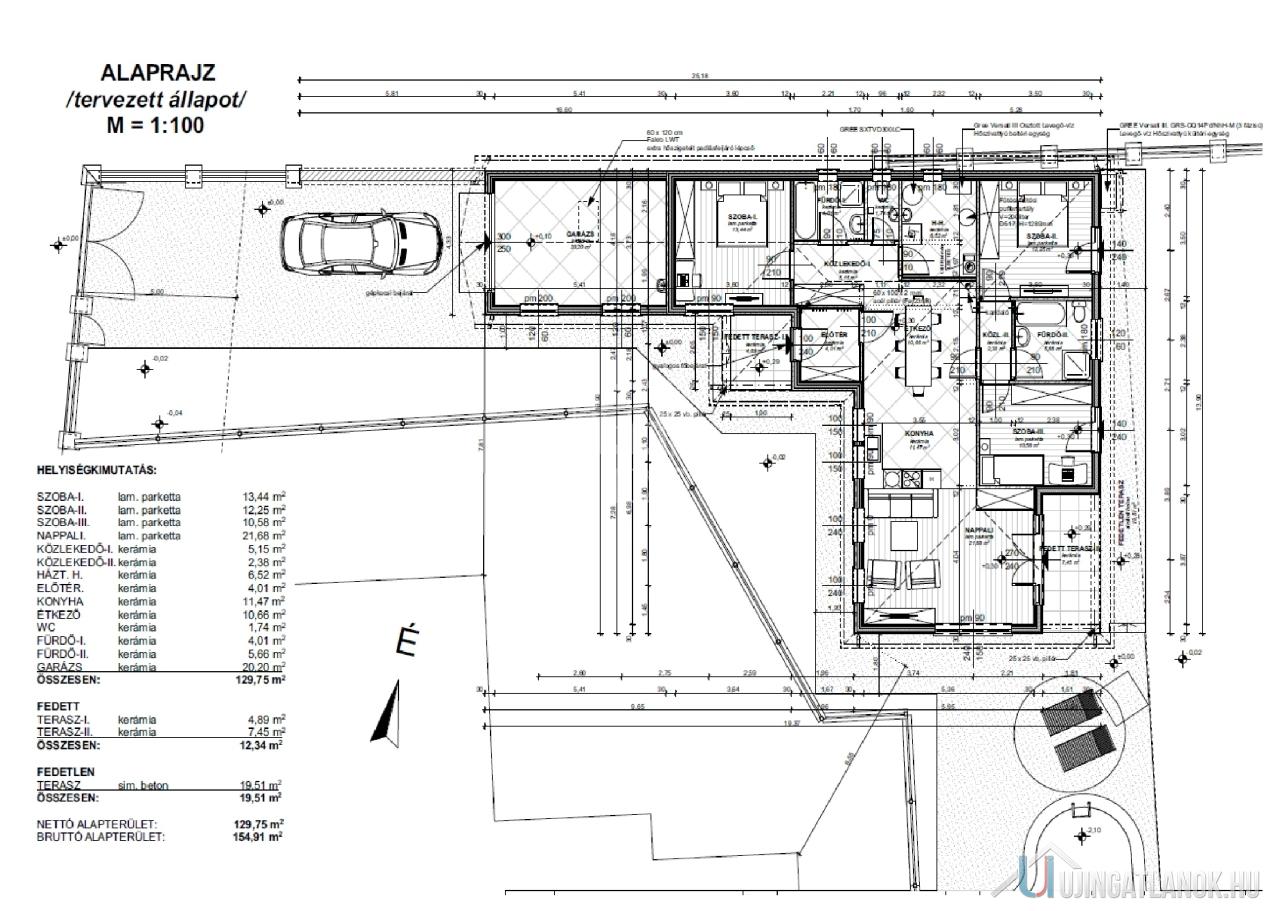 ● Nappali + 3 hálószoba + háztartási helyiség +2 fürdő + kamra +garázs+ terasz.