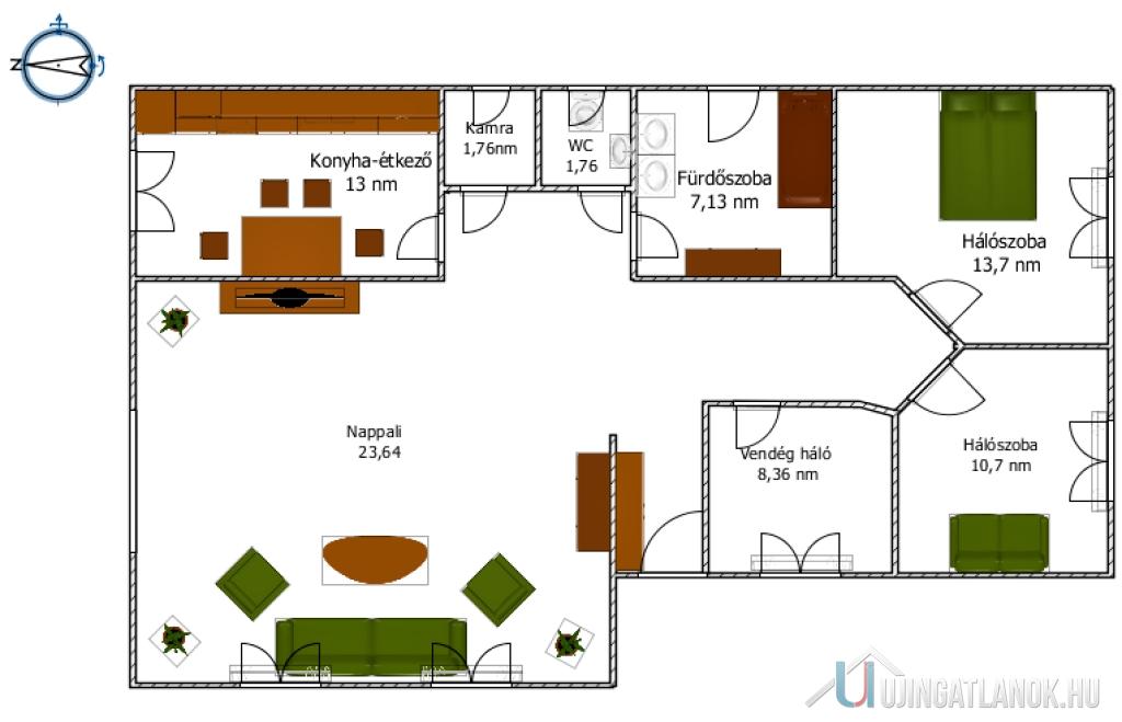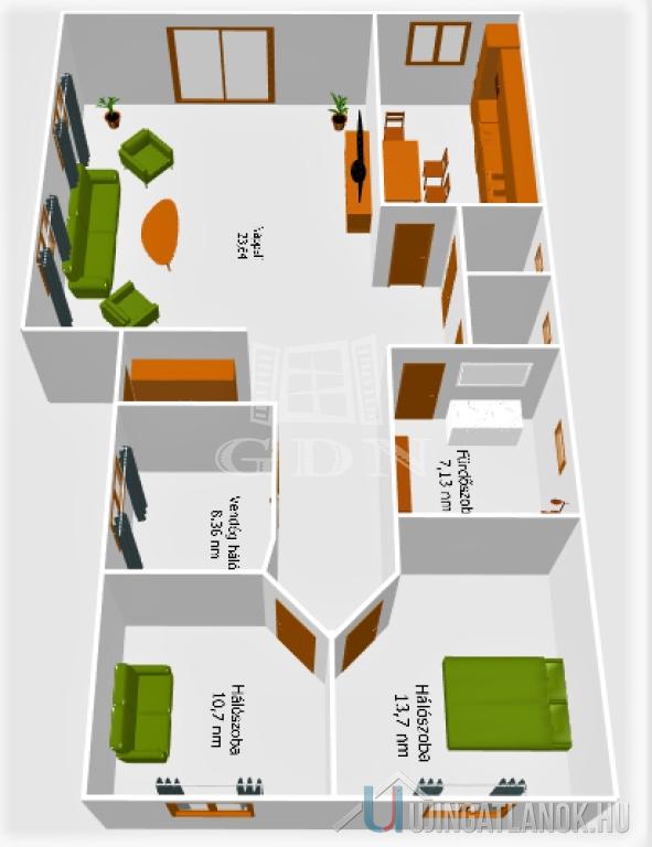 - belső elosztás: nappali, konyha (vadonatúj háztartási gépekkel felszerelt), fürdőszoba, WC, háztartási helyiség, 3 hálószoba, közvetlen kertkapcsolatos nagy terasz,