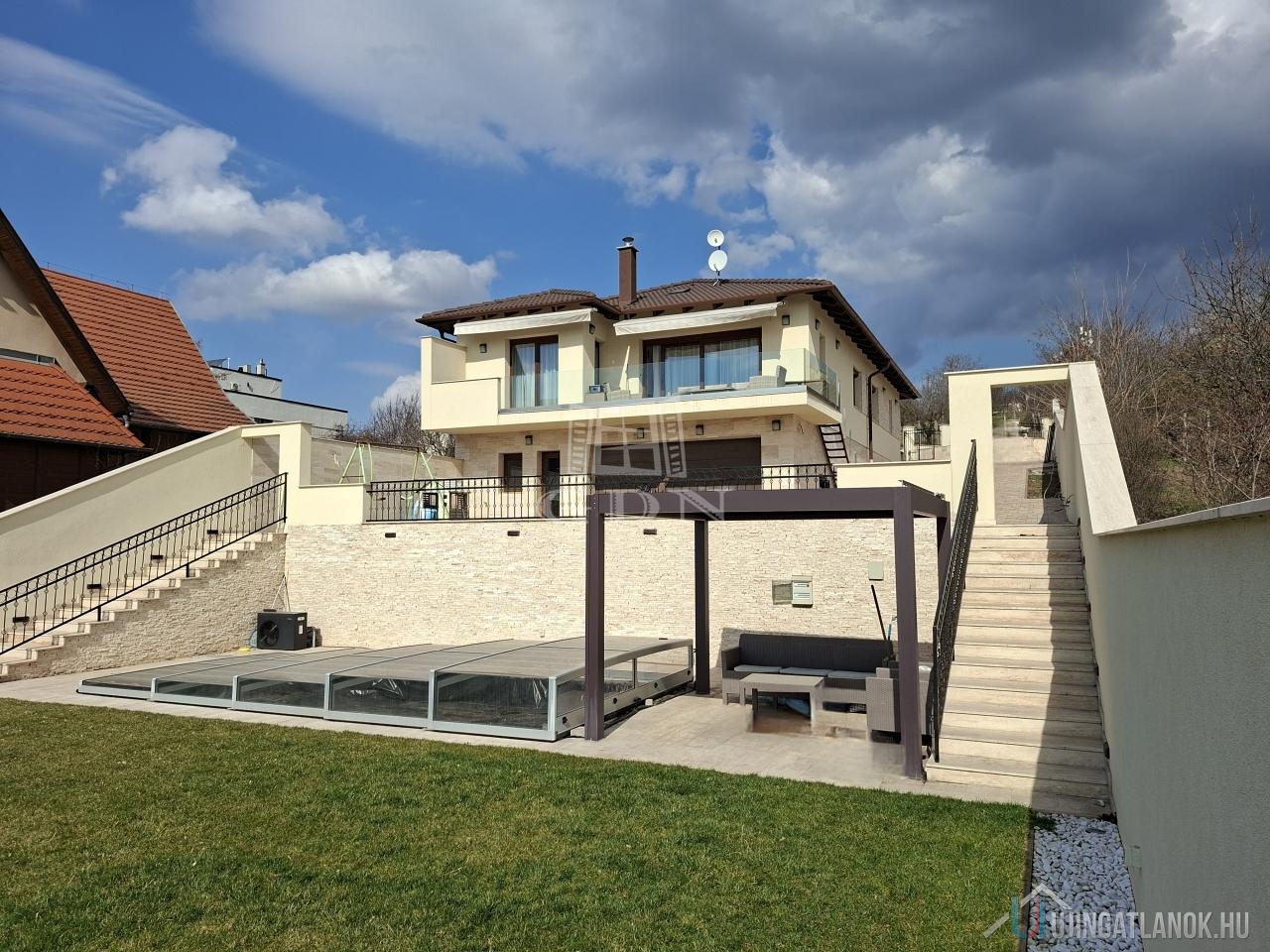 A lankás teleknek köszönhetően utcafronton 1, a kert felé pedig 2 szintes az épület. A pince szinten 2 állásos, tágas garázs, tároló résszel, egy nyárikonyha és egy zuhanyzó kapott helyet. A földszinten 4 szoba, 2 fürdőszoba és hatalmas, tágas nappali egy légtérben, mégis némileg elkülönülten található az étkező és a teljesen felszerelt konyha. A nappaliból nyílik az erkély, ahol kényelmesen elfér egy 6-8 személyes étkezőasztal. A teraszról és a pince szintről is a kertbe jutunk, ahol a csodálatos panoráma mellett egy medence is elénk tárul, amit a kiépített hőszivattyús rendszerrel fűteni is tudunk. A kertben automata (robot) fűnyíró gondoskodik a tulajdonosok kényelméről.