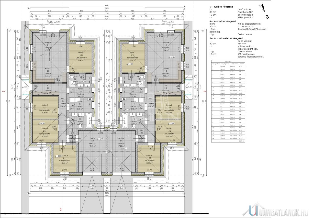 Mindkét házrész nettó 128 m²-es, azonos méretű 541 m²-es kizárólagos használatú telekrészekkel, 4 külön hálószobával, amerikai konyhás nappalival, illetve két fürdőszobával és egy 19,8 m²-es garázzsal.