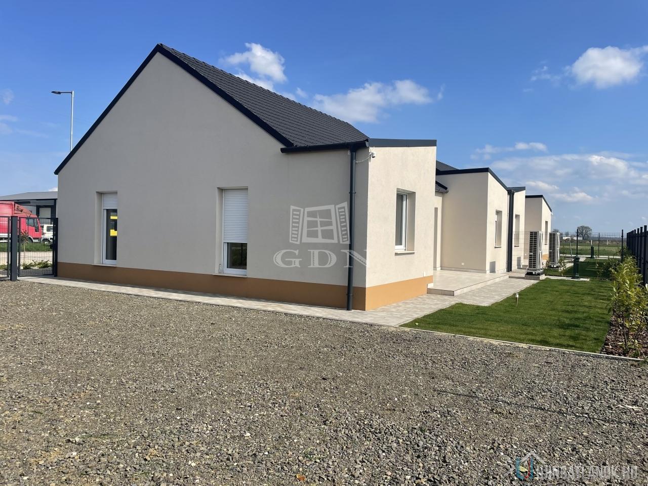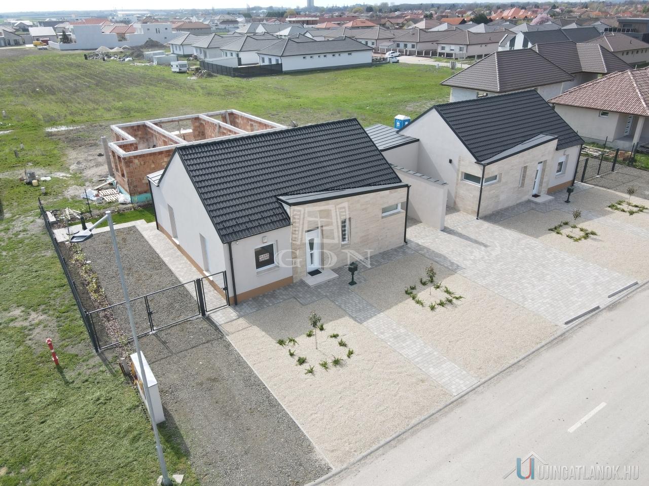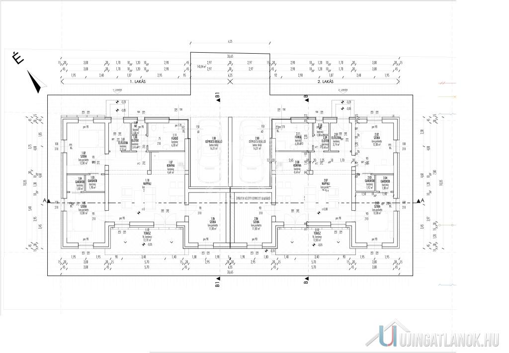 Jászberényben a Szatmári lakóparkban a Bársony utában, 798 m2-es telken, eladó 2db nettó 85,32m2-es + 12,83m2 terasszal és 16,31 m2-es gépkocsibeállóval rendelkező, 30-as Porotherm P30 N+F tégla falazóelemmel épült, fafödémes, 3 szoba plusz amerikaikonyha- nappalis kertkapcsolatos Ikerházfél.
