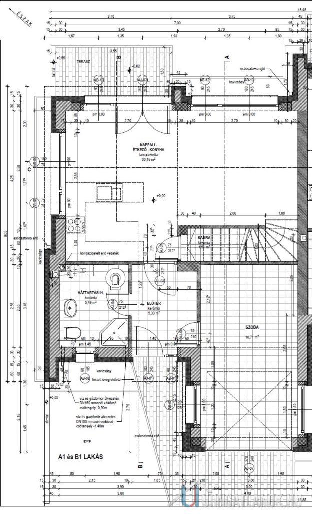 - alsó szint: nappali-étkező-konyha, hálószoba (garázs helyén), wc-zuhany-mosdó, terasz.