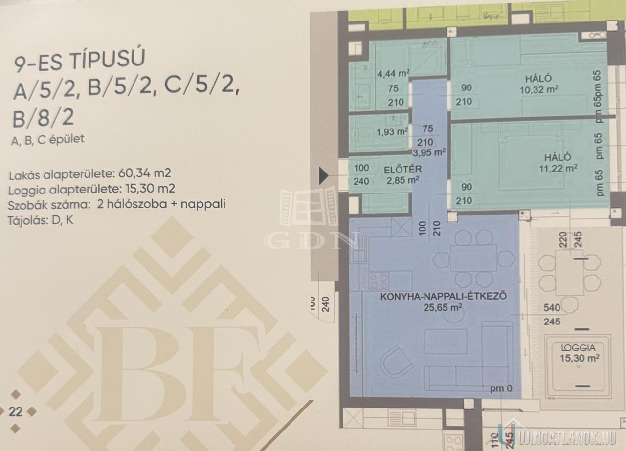 Az A/5/2-es típusú első emeleti osztott lakás 60,34 négyzetméteres, tartozik hozzá  loggia amely alapterülete 15,30 négyzetméter. A 60,34 négyzetméteren amerikai konyha, 2 hálószoba, nappali, fürdőszoba, valamint külön WC is található. A loggián napozhat vagy akár egy jakuzzit is telepíthet.  Az ingatlanhoz mélygarázsok és tárolok is megvásárolhatóak.