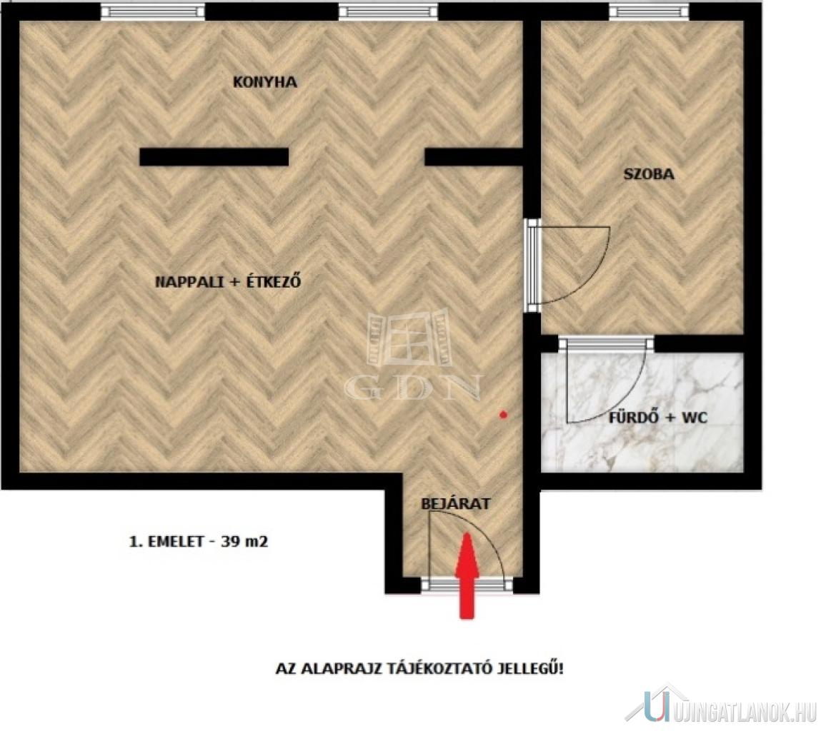 1. EMELET: 39 m2 – 2 szoba – 1 fürdő