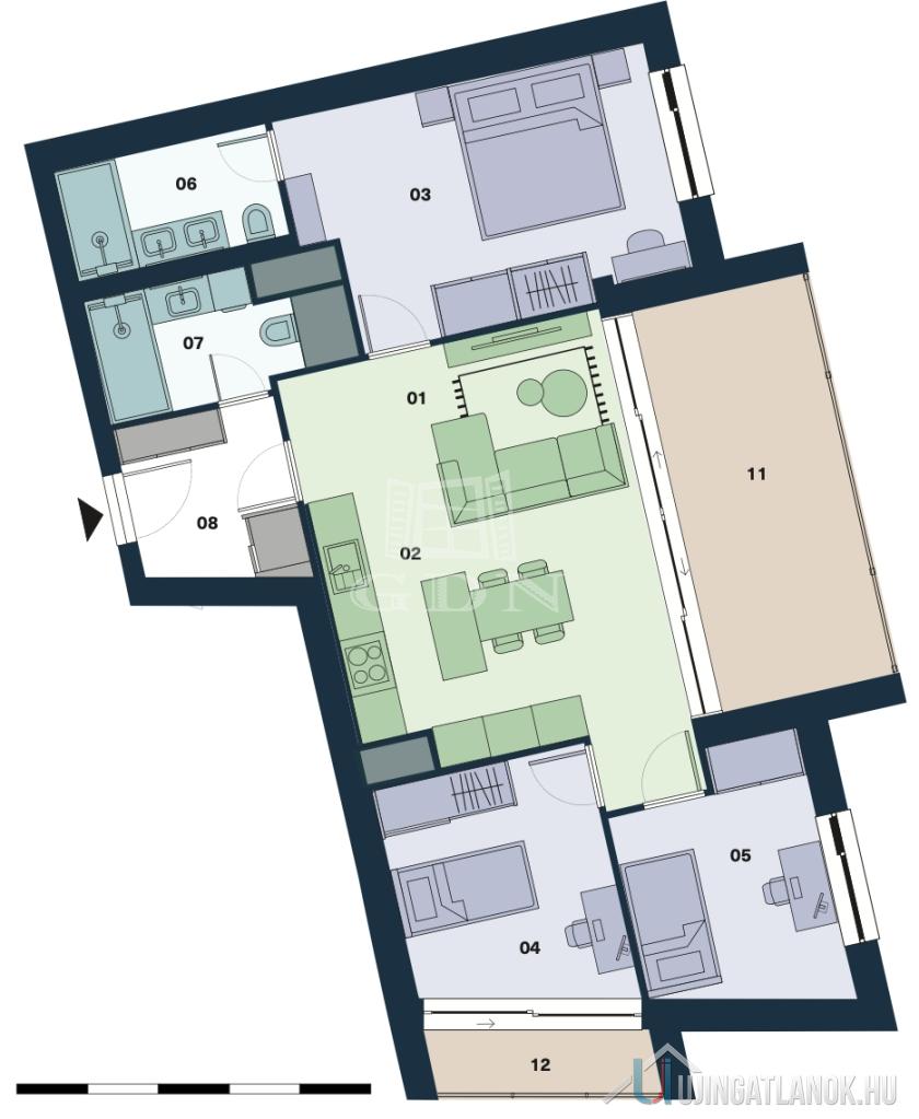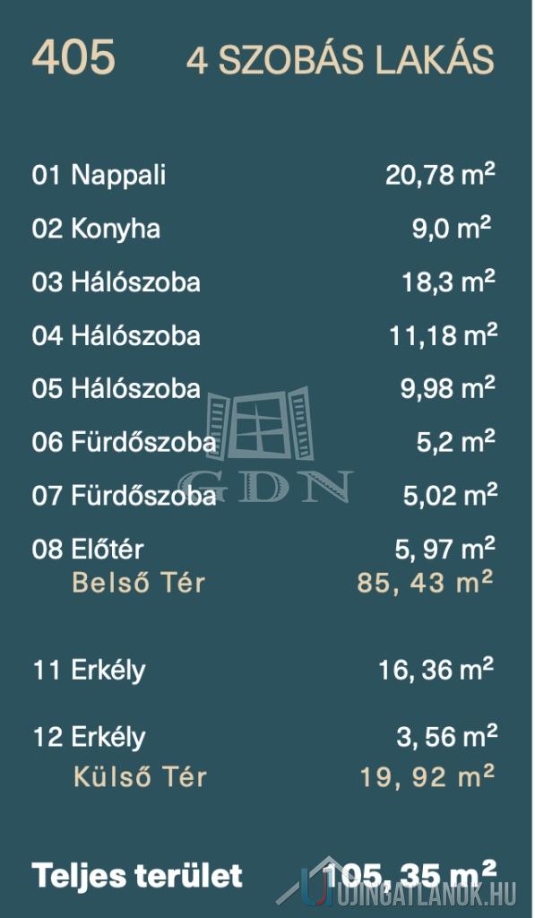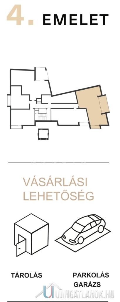 A 6 emeletes társasház 4. emeletén található ez a piacon hiánypótló három hálószobás dupla komfortos, városi panorámás ingatlan. A központi tér a közel 30m2-es konyha -nappali melynek nyugati frontján egy összefüggő üvegfelület, nagy toló ajtókkal határolja a 16m2-es terasztól mely tavasztól, őszig a nappali kiterjesztése. A nyugati benapozásnak köszönhetően napfürdőzhetnek a leendő lakók, az alapterület üvegfelület aránynak köszönhetően pedig télen nyáron nagyon világos, mint egy igazi műterem lakás. A fő háló, mely fürdőszoba kapcsolatos az átgondolt tervezésnek köszönhetően nagyszerűen elkülönül a második, illetve harmadik hálószobától.