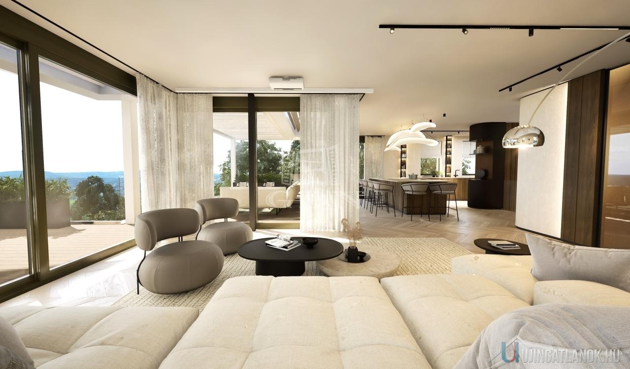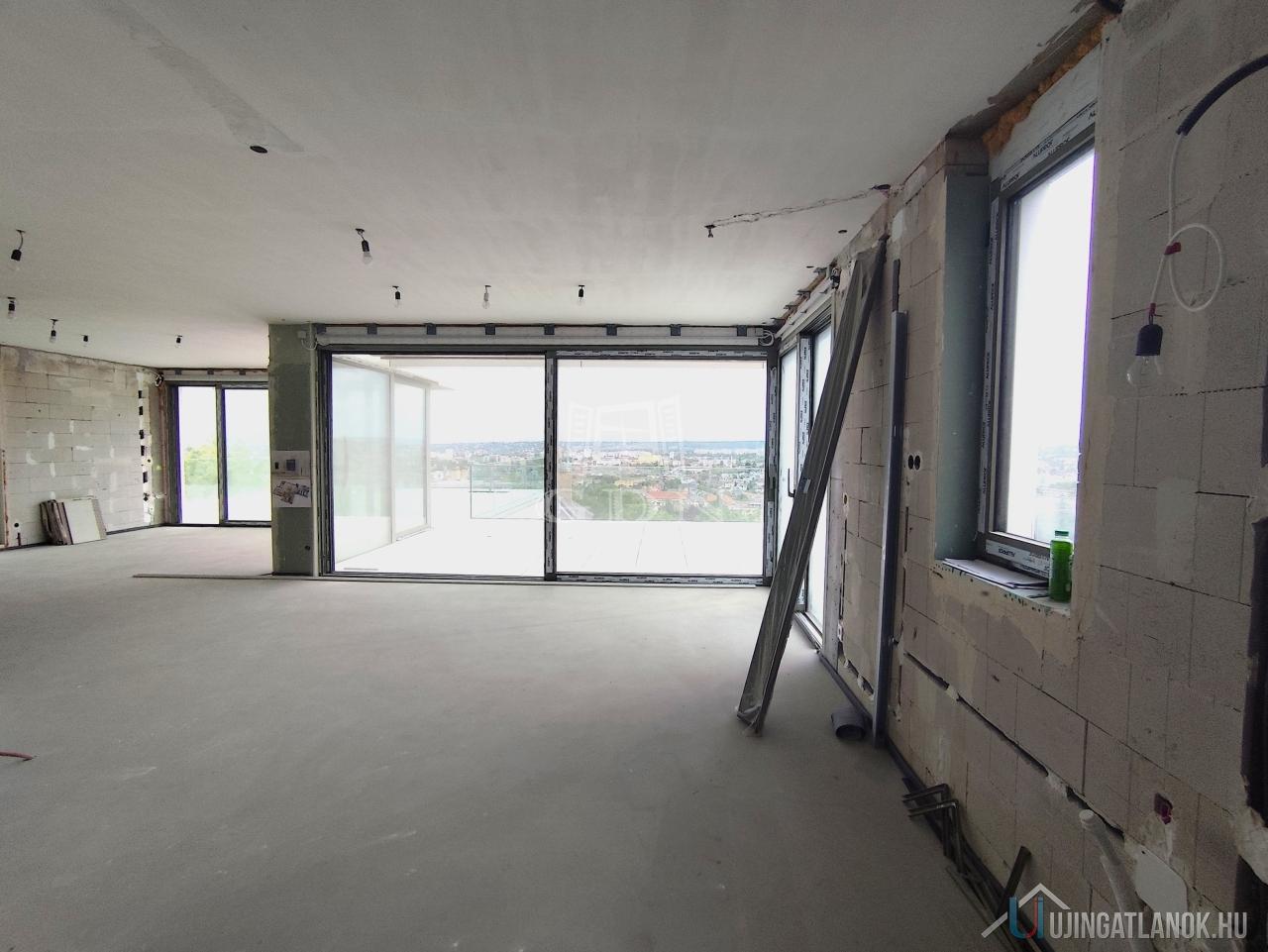 A felső szinten nappali, konyha, étkező, vendégmosdó és a lenyűgöző panorámás tetőterasz várhat pergolával, medencés résszel. Az alsó szinten 3 hálószoba, 2 fürdő és további teraszok kaptak helyet. A lakás 70%-os készültségben van – így új tulajdonosa saját ízlése szerint alakíthatja ki, vagy kulcsrakészen is megvásárolhatja. A garázs alkalmas lehet szauna, welness kialakítására a közel 80 m2-en.