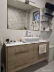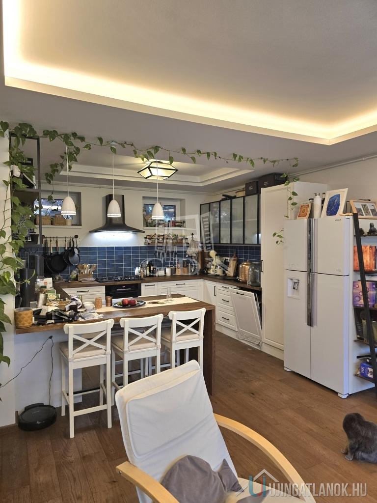A szobákban, a konyhában és a nappaliban eredeti svéd tölgyfa padló, az előtérben és a fürdőben gyönyörű kerámia burkolatú a padozat. Az amerikai konyhás nappaliban fa konyhabútorok egyedi tervezésűek, tömör tölgyfa munkalappal, beépített elektromos elektromos sütővel, gáz főzőlappal, elektromos páraelszívóval, és mosogatógéppel valamint elektromos szelektív kukával.