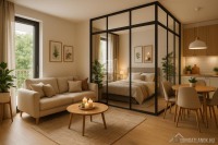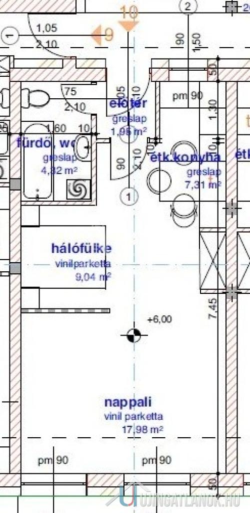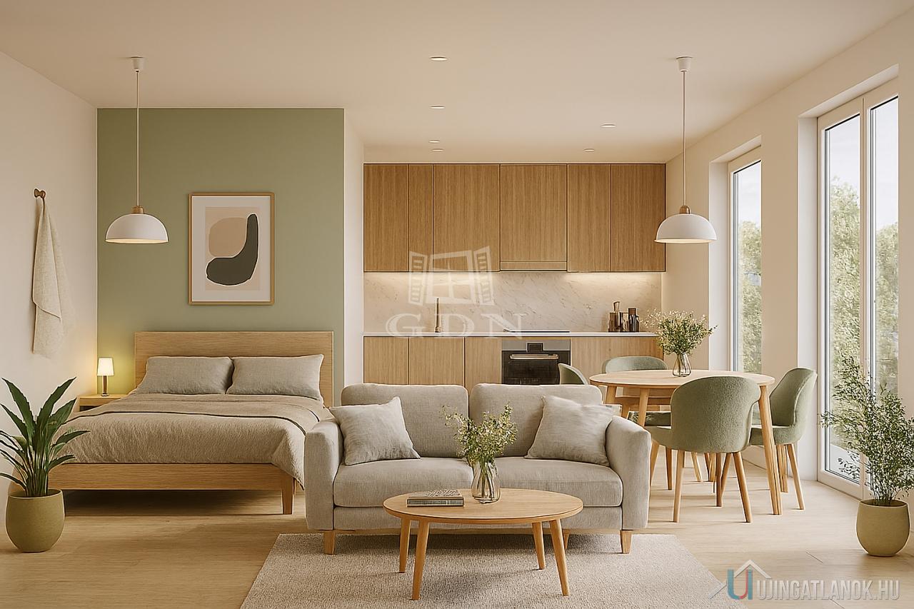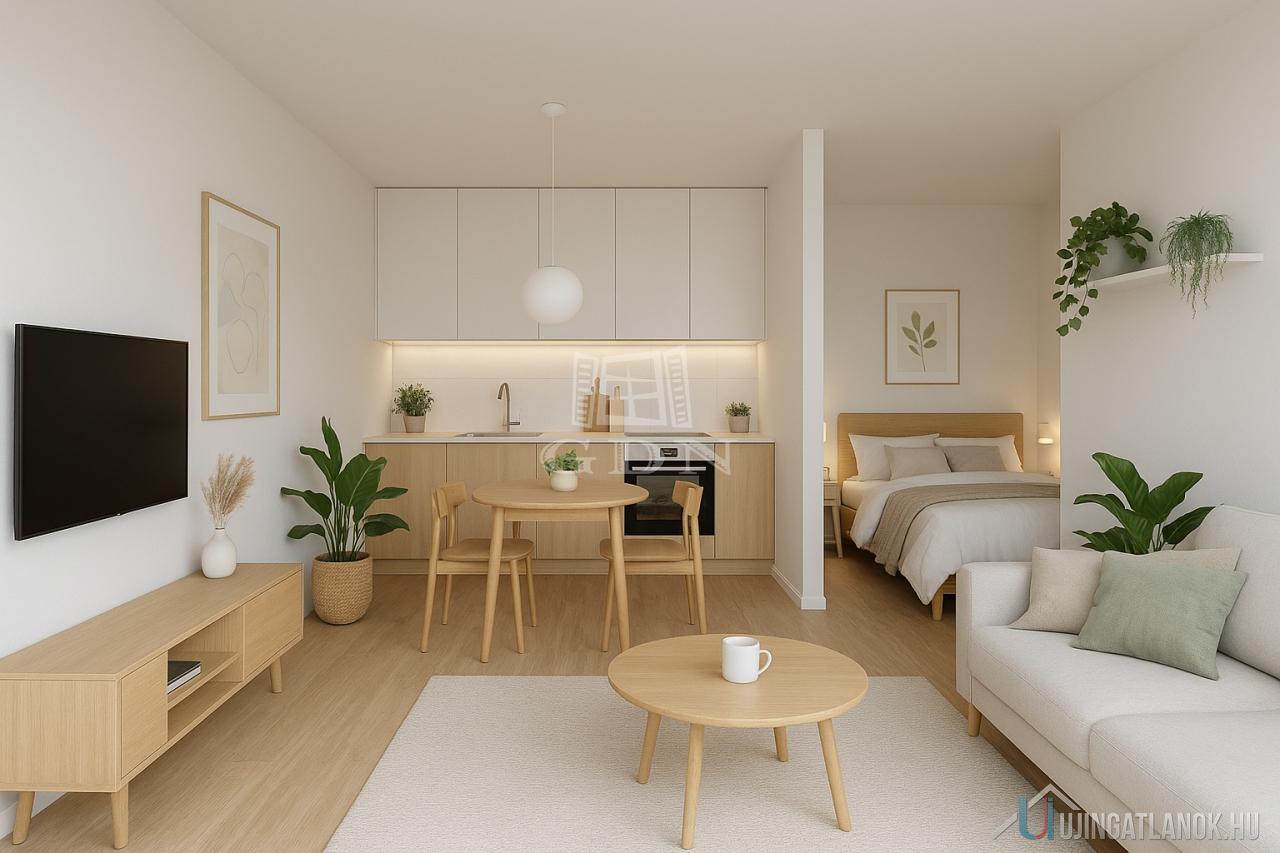 A lakás a tervek alapján amerikai konyhás nappali, hálófülke, fürdőszoba, és előtér térfelosztású.