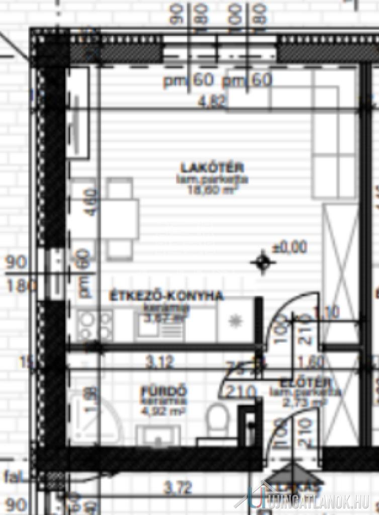 A lakás 29,50 nm, helyiségei:előtér 2,73 nm, fürdőszoba 4,73 nm, lakótér 22,04 nm.