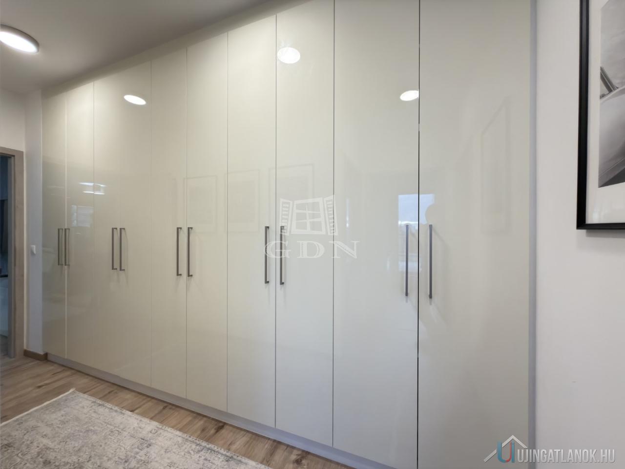 A tulajdonosok kényelmét tovább növeli, hogy a lakás szintjén egy saját, zárható, 6,46 m²-es tároló is rendelkezésre áll, amely a vételár részét képezi. A társasház elektromos kapun keresztül megközelíthető, fedett garázsában két gépkocsibeálló tartozik a lakáshoz, amelyek szintén benne vannak az árban. Az eladási ár tartalmazza továbbá a beépített szekrényeket — az előszobában, gardróbban, fürdőben és a nappaliban — valamint a modern, gépesített konyhabútort is.
