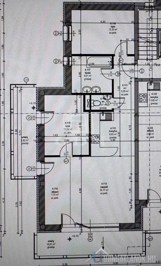 nappali-konyha-étkező 36,84m2, szoba 12,33m2, szoba 11,34m2, fürdőszoba 6,61m2, toalett 1,41m2, előszoba 5,05m2, erkély 10,91m2, erkély 8,82m2;