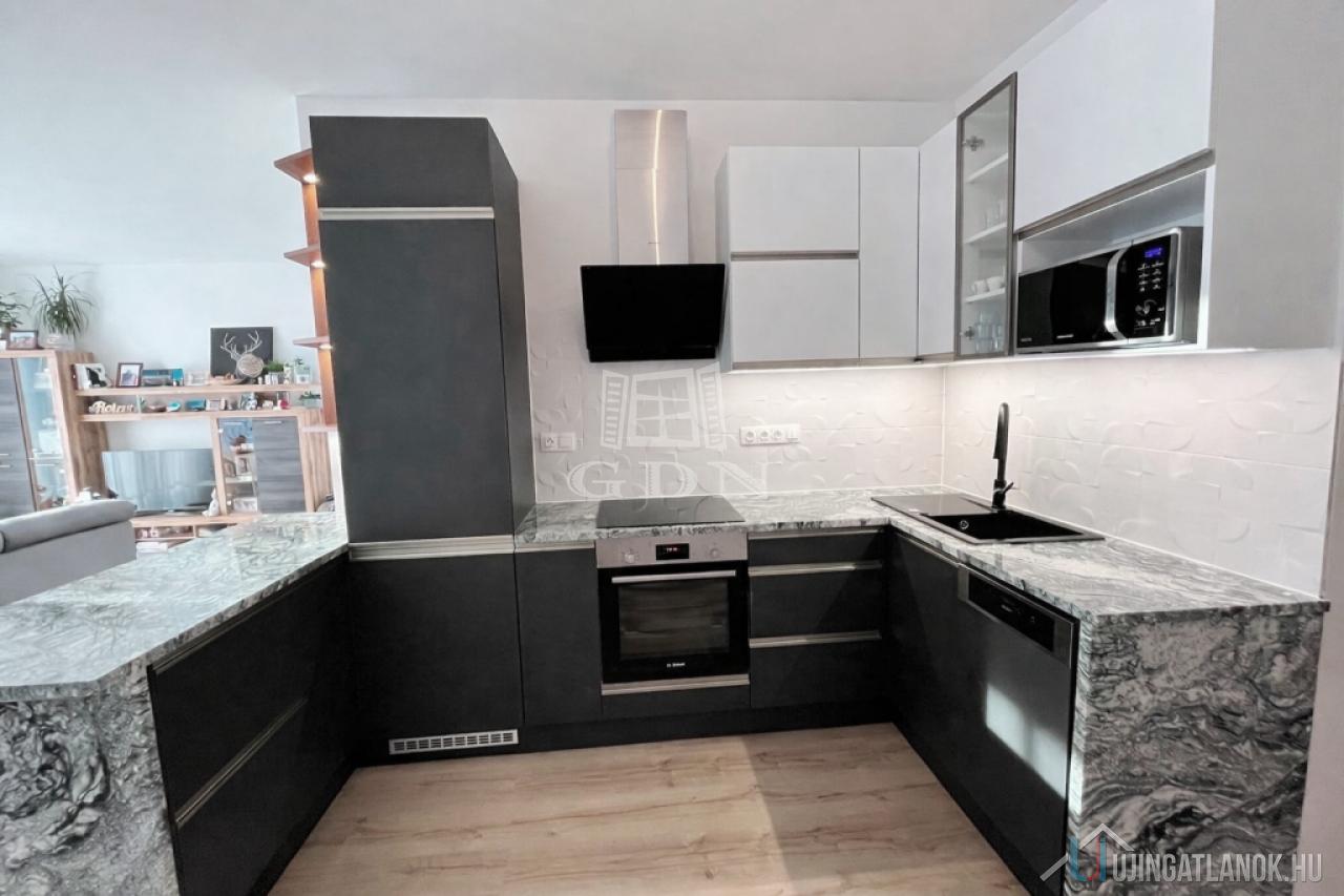 A gránit munkalapos, prémium gépekkel beépített, por,- és újlenyomat álló konyhabútor, a vételár részét képezi.