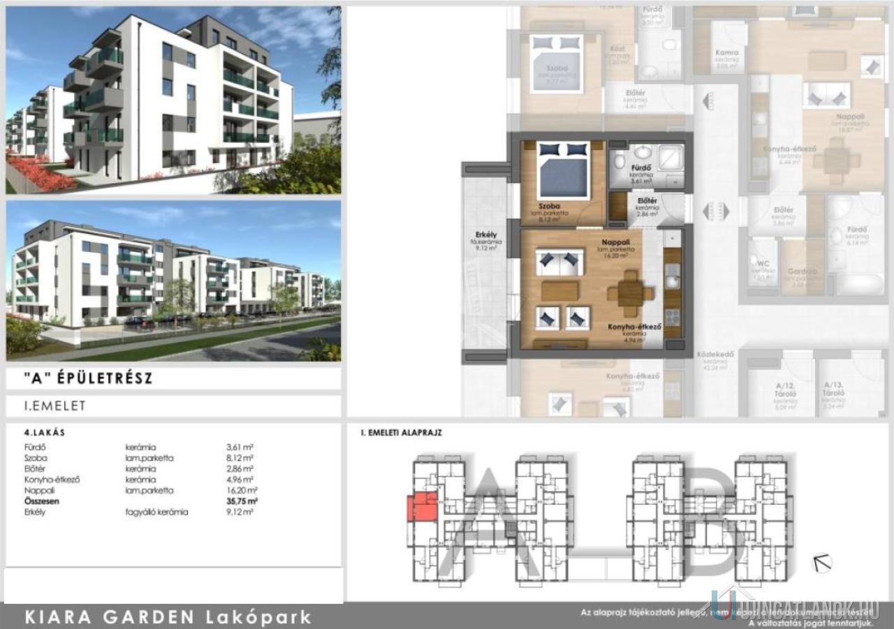 Szombathely zöldövezeti, dinamikusan fejlődő városrészén, energiahatékony, modern lakások várják új tulajdonosaikat. Kiara Garden lakóparkban kettő ütemben épülő , minden igényt kielégítő lakásai nappali+1 szobával, nappali+2 szobával, nappali+ 3 szobával fognak rendelkezni. Az ingatlanokhoz nagy erkélyek teraszok is tartoznak. A legnagyobb lakás dupla komfortos kialakítású lesz. Egyedülállóktól a nagy családosokig megfelelő otthona lehet bárkinek. A belváros közeli ingatlanok lehetőséget biztosítanak egyedi belső kialakításokra. A lakás gazdaságos fűtéséről és melegvíz ellátásáról távhő szolgáltató gondoskodik. A fűtésrendszer egyedileg szabályozható, saját hőmennyiség mérővel ellátott. A hőleadás padlófűtésen keresztül történik. Az ingatlanok ideális hőmérsékletét, a nappaliban elhelyezett split klíma biztosítja. Az épületben kellő számú zárható tároló kerül kialakításra, külön bejárattal. ( 2.96 m2-es tároló 1 790 000 Ft ) Természetesen vannak nagyobb tárolók is. A lakótömbök udvarán található felszíni parkolók ára 1 490 000 Ft. Bővebb tájékoztatásért kérem vegye fel velem a kapcsolatot.
