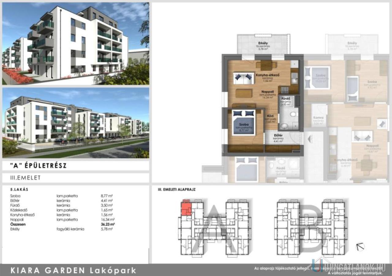 Szombathely zöldövezeti, dinamikusan fejlődő városrészén, energiahatékony, modern lakások várják új tulajdonosaikat. Kiara Garden lakóparkban kettő ütemben épülő , minden igényt kielégítő lakásai nappali+1 szobával, nappali+2 szobával, nappali+ 3 szobával fognak rendelkezni. Az ingatlanokhoz nagy erkélyek teraszok is tartoznak. A legnagyobb lakás dupla komfortos kialakítású lesz. Egyedülállóktól a nagy családosokig megfelelő otthona lehet bárkinek. A belváros közeli ingatlanok lehetőséget biztosítanak egyedi belső kialakításokra. A lakás gazdaságos fűtéséről és melegvíz ellátásáról távhő szolgáltató gondoskodik. A fűtésrendszer egyedileg szabályozható, saját hőmennyiség mérővel ellátott. A hőleadás padlófűtésen keresztül történik. Az ingatlanok ideális hőmérsékletét, a nappaliban elhelyezett split klíma biztosítja. Az épületben kellő számú zárható tároló kerül kialakításra, külön bejárattal. ( 2.96 m2-es tároló 1 790 000 Ft ) Természetesen vannak nagyobb tárolók is. A lakótömbök udvarán található felszíni parkolók ára 1 490 000 Ft. Bővebb tájékoztatásért kérem vegye fel velem a kapcsolatot.