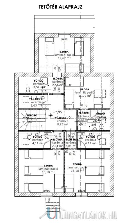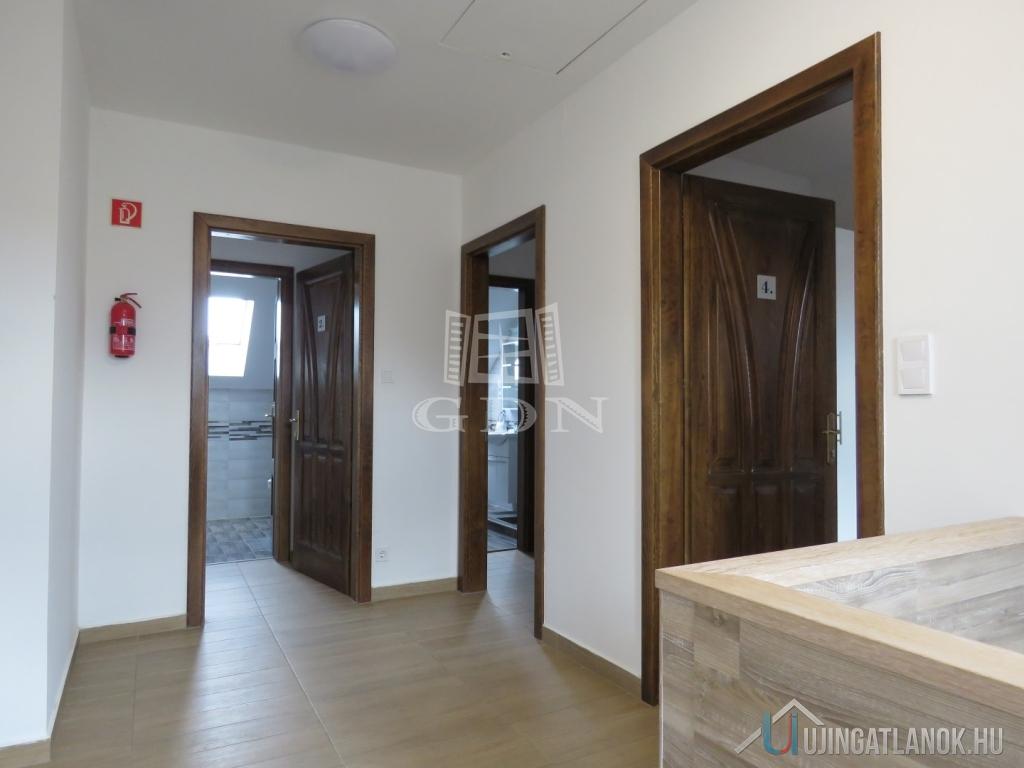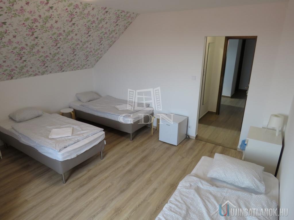 A kétszintes épület emeleten négy (2db 4 ágyas és 2db 3 ágyas), önálló fürdőszobás apartman, illetve egy teakonyha került kialakításra.
